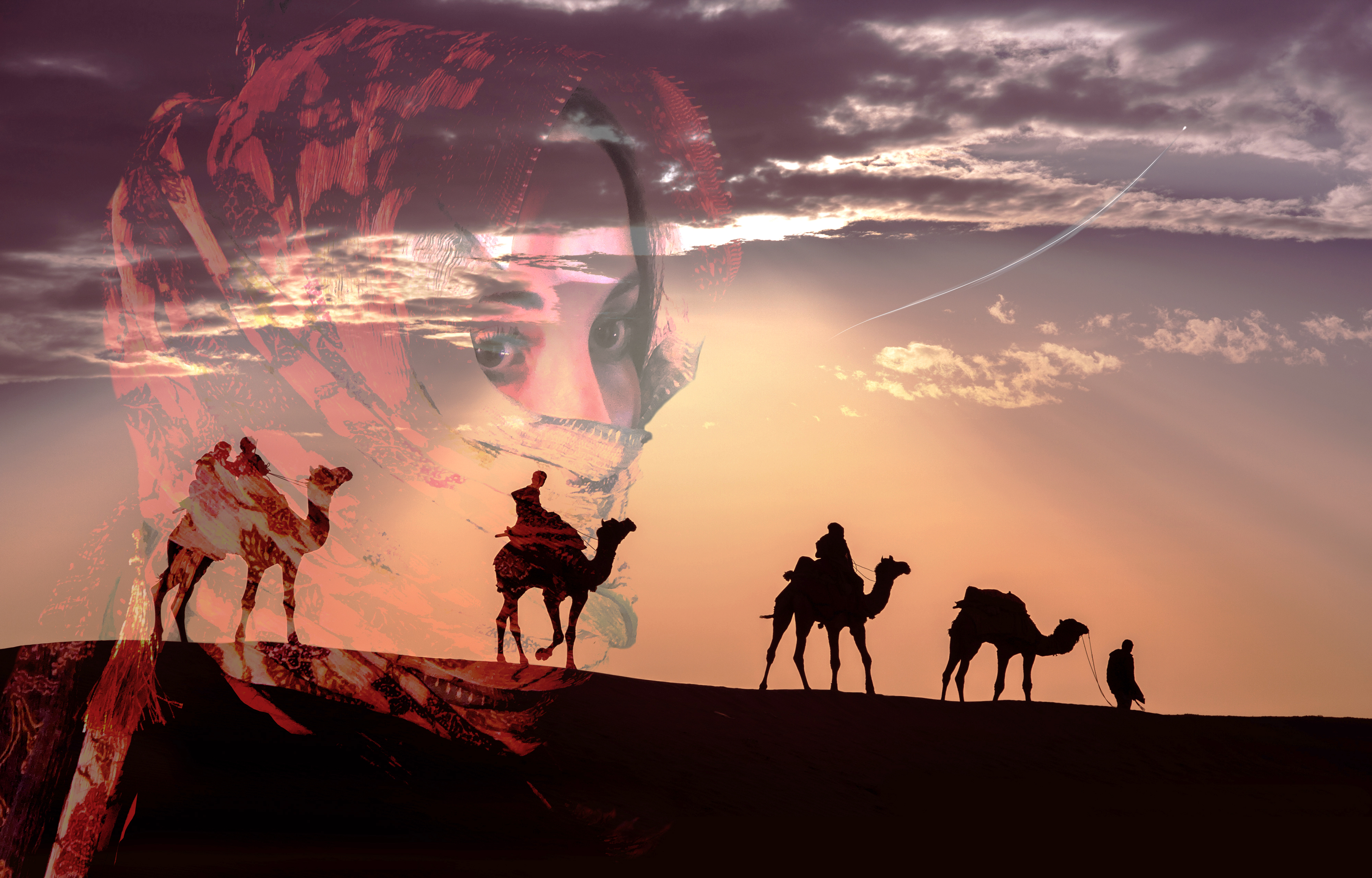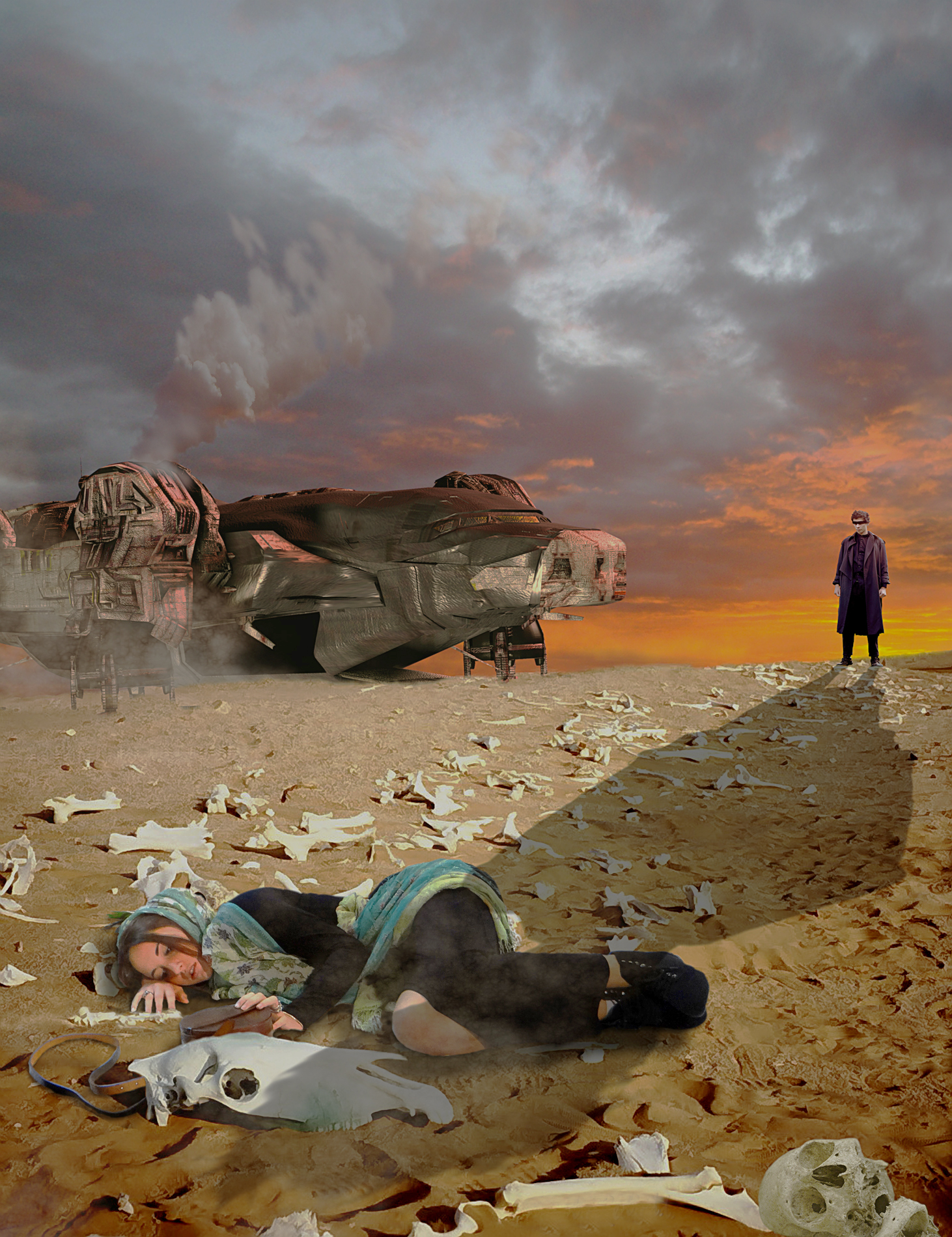 A large proportion of Ethania now witness a much larger perspective, as it intrudes on their mundane lives. The Traveler persues and fires plasma from its mining laser. The smaller vehicle spirals out of control and explodes in a fireball amongst the trees of the surrounding hills.“By my death the gods will look favorably upon us my Queen”, screams the demented woman as she plummets to the unforgiving stone courtyard below. The Queen is both fascinated and horrified by such fanaticism, “That’s the mystic woman who has been prophesising about the end of the world. I sincerely hope, if there is an after-life, she can find some peace there. The pace of change is exceeding my people’s ability to adapt to it and these incidents of hysteria are a symptom. To be at the center of huge historical events is both a privilege and burden – one I hope we can survive”.Amala has noticed her hand maiden’s distracted introversion but has chosen to ignore it. The Princess has found her to be honest, genuinely loyal and hopes she will eventually confide in her. Davina is trying to reason her way out of a terrible personal crisis. Political pressures in distant Galassa have set in motion plans to intimidate her with threats of violence toward her father. She must simply obtain information for them or risk reprisals against those she loves – betrayal of state or family. A recently opened letter is causing Amala some excitement. Friends in Galassa have promised, if she travels there, it may be possible to gain the release of her father.The Queen is furious with her daughter, “How could you be so naive as to believe this story. It is a ruse to trap you in Galassa. They would then have both the King and the heir. I absolutely forbid you to go on this escapade”.The Princess has made up her own mind, and travel arrangements, with a sympathetic trader. She will travel incognito and in defiance of the Queen. They leave that night. Assembling quietly and moving off across the dry regions – slowly.Camel caravan silhouette through the sand dunesThe traders are a simple and superstitious people. When a distant light in the sky starts moving toward them, first consternation, then a panicked flight. Amala’s prior acquaintance with the flying machines have left her curious rather than fearful. As it crosses in front of her the ring on her finger resonates in sympathy with the sound emanating from the machine – magnetism or something else? The ring is a combination of metals and inset with a form of stone only found on Ethania. The machine does not alter course and soon disappears.Amala is alone now. Supplies have gone. She follows a camel track and hopes it knew where it was going. Piles of bones along the way are not reassuring. It is too late for regrets about being stupid or never seeing what might have become of her life and world. She understands how truly precious was her day to day life – never to be repeated, each day unique and special. There is probably only a day left then the scavengers. She trudges on………..She collapses in the bones and waits for the end. Unconscious, the approaching roar goes unnoticed. The ship lands in a cloud of flying grit, bone fragments and greasy smoke. The Traveler cannot wait any longer. Contact restrictions be damned. They are not here. They are 1136 of his home world’s years in the past. They are dead and dust now. Intervention is required now, and a constant flexibility. He needs these people’s help and they need his guidance. He steps forward with determination and enthusiasm. A decision has been made and action will move inevitably on from that.